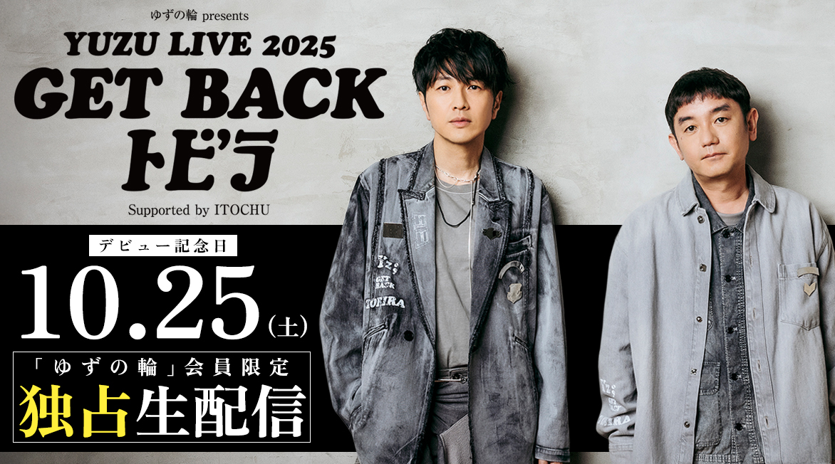 INFORMATION 2025.10.01 LIVE 「ゆずの輪 presents YUZU LIVE 2025 GET BACK トビラ Supported by ITOCHU」10月25日(土)公演の模様を「ゆずの輪」会員限定独占生配信決定! 2025.09.30 EVENT 「LIVE SDD 2026」に、ゆずの出演が決定! 2025.09.28 TICKET 「ゆずの輪 presents YUZU LIVE 2025 GET BACK トビラ Supported by ITOCHU」明日9月29日(月)18:00より「ゆずの輪」会員追加先着販売受付スタート! 2025.09.26 TICKET 『ゆず×FM OSAKA 55th Anniversary Premium Concert ゆずオーケストラ』開催決定!本日9月26日(金)12:00より「ゆずの輪」会員チケット先行受付スタート! 2025.09.17 GOODS 「ゆずの輪 presents YUZU LIVE 2025 GET BACK トビラ Supported by ITOCHU」グッズラインナップ公開! 2025.09.12 TICKET 「YUZU JAPAN LIVE 2025 GET BACK Supported by Japanet」明日9月13日(土)15:00より長崎スタジアムシティ公式アプリ会員先行受付スタート! MORE